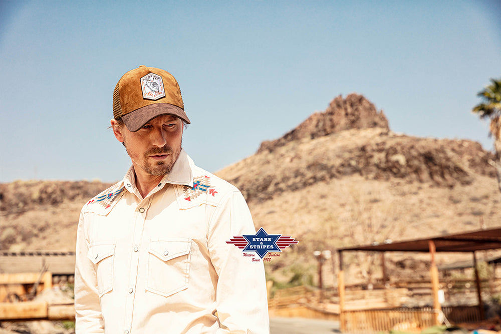 The 2-colour western trucker cap, consisting of 5 panels without a centre seam, is a real eye-catcher. The hard-wearing suede-look body is high-quality and robust. The elaborately embroidered patch at the front, the airy mesh insert and the brown suede-look visor with decorative stitching make the curved brim cap a cool collector's item. It is ideally suited for outdoor activities. The trucker cap has a button covered in cap fabric on the top that creates the perfect finish. Adjustable in size thanks to the classic snapback closure at the back of the head. This guarantees the perfect fit. A cotton sweatband ensures optimal moisture regulation. The trendy trucker cap in a timeless design can be combined with any style in a versatile way.