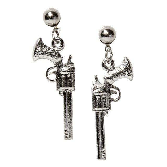 These silver pistol earrings may be small but a bold statement. This pair measures 1 1/2" x 1 1/4" featuring a 1/2 ball stud.
