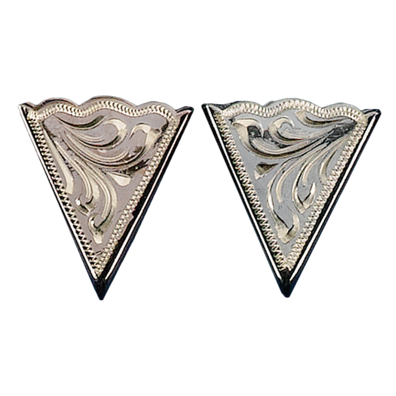 Silver-tone collar tips with engraved filigree design. Sold in pairs, these tips come with flat screws on the back, allowing you to securely attach them to the tips of collar shirts without causing any damage—no pins or holes. They are easy to put on and remove.