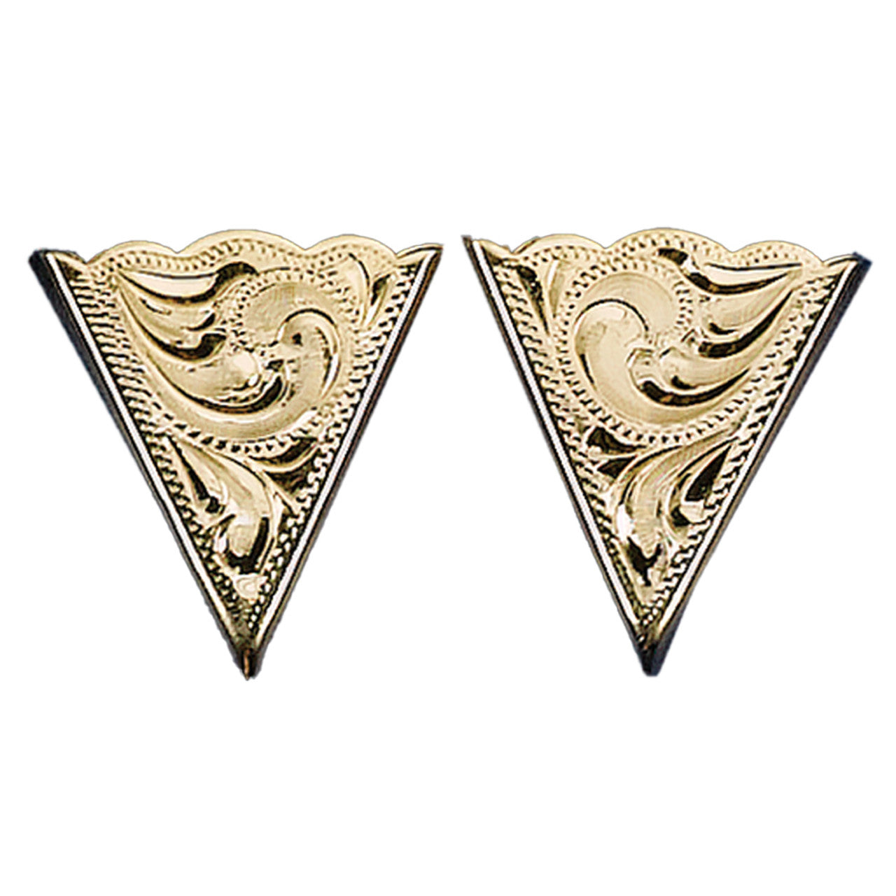Gold-tone collar tips with diamond-cut western scrolls motif. Sold in pairs, these tips come with flat screws on the back, allowing you to securely attach them to the tips of collar shirts without causing any damage—no pins or holes. They are easy to put on and remove.