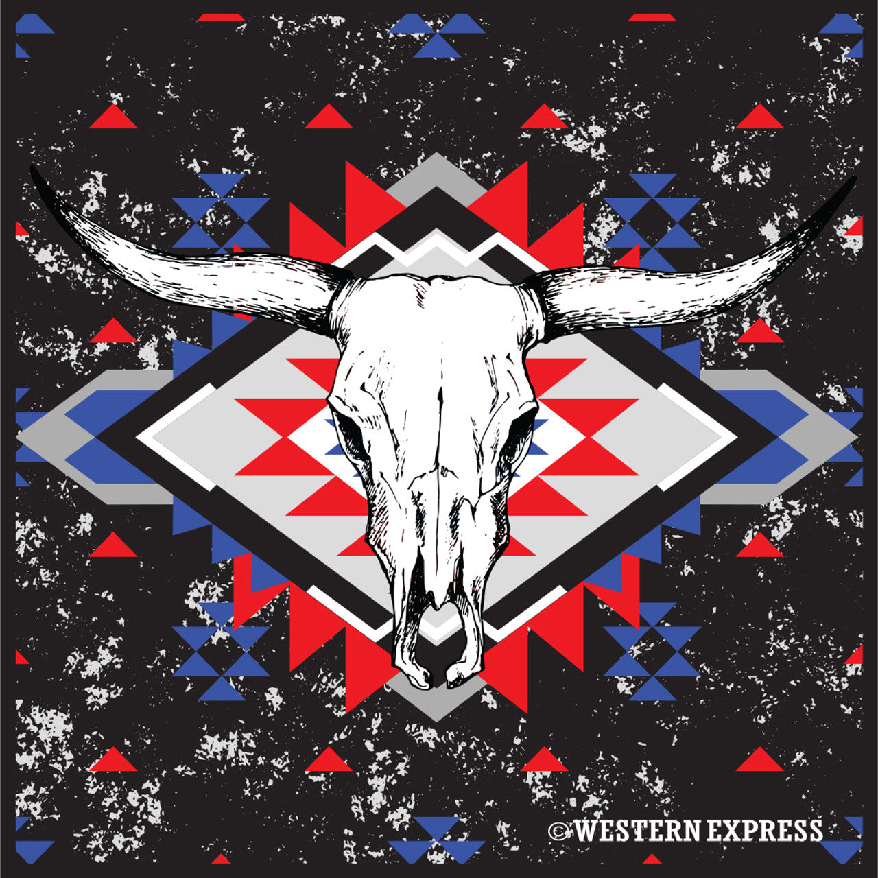 Our exclusive Western Express bandana features a Southwestern pattern background with a steer skull center design. Branded and individually packaged.
