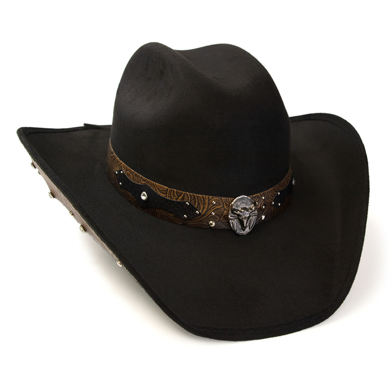 Western Express CL-94 Black Suede Finish Western Hat with Steer Skull on Hat Band & Leather Sides