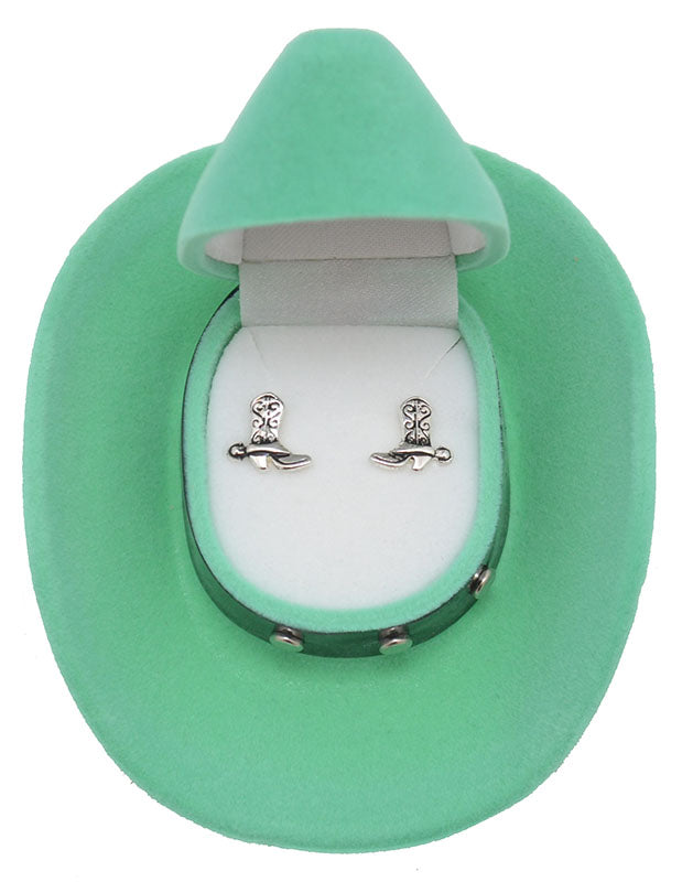 Western Fashion Cowboy Boot Earrings have a silver-plated finish. Boots have a delicate design and even a spur! They are packaged in a velour Cowboy Hat Gift Box with a Studded Hatband! Box colours may vary. Contain no lead, nickel, or cadmium. Earrings measure 3/8" x 3/8" and Cowboy Hat Gift Box measures 3-1/2" x 3" x 1-1/2". Both items are packaged in a box measuring 3-3/4" x 3-3/4" x 1-1/2"