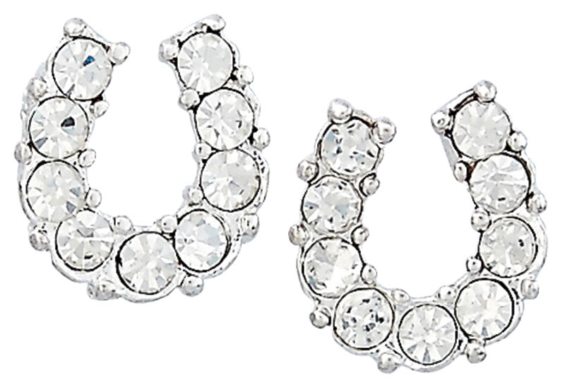 Adorable Horseshoe Earrings with Clear Rhinestones in a colourful, velour Horse Head Gift Box. Box colours may vary. Earrings measure 1/4" x 3/8". Horsehead Gift Box measures 2" x 2-1/2" x 1-1/4". Both items packaged in a white box that measures 2-3/4" x 2-1/4" x 1-1/2". Earrings are silver plated and lead safe.