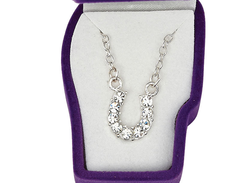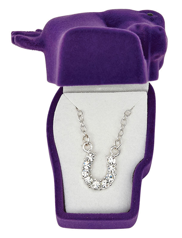 Horseshoe Necklace with clear Rhinestones in a colourful, velour Horse Head Gift Box. Box colours may vary. Rhinestone colours include Pink, Blue, Clear and Green. Pendant measures 1/2" x 1/2" and is on a chain that measures 16", with a 2" adjustment. Horsehead Gift Box measures 2" x 2-1/2" x 1-1/4". Both items packaged in a white box that measures 2-3/4" x 2-1/4" x 1-1/2". Necklace is silver plated and lead safe.