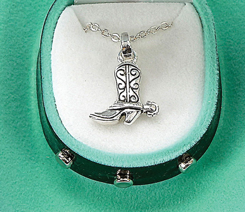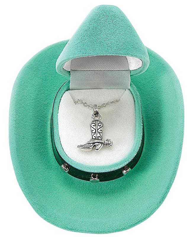 Western Fashion Cowboy Boot Necklace has a silver-plated finish. Boot pendant has a delicate design and even a spur! It is packaged in a velour Cowboy Hat Gift Box with a Studded Hatband! Box colours may vary. Contains no lead, nickel, or cadmium. Pendant measure 7/8" x 5/8" and Cowboy Hat Gift Box measures 3-1/2" x 3" x 1-1/2." Both items are packaged in a box measuring 3-3/4" x 3-3/4" x 1-1/2".