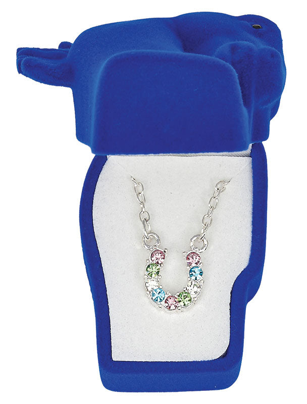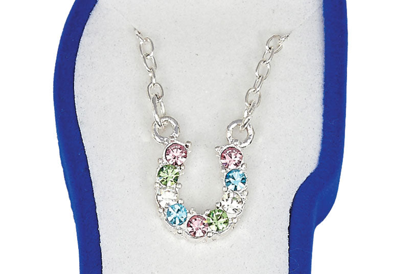 Colorful Horseshoe Necklace with Multi-Color Rhinestones in a colorful, velour Horse Head Gift Box. Box colors may vary. Rhinestone colors include Pink, Blue, Clear and Green. Pendant measures 1/2" x 1/2" and is on a chain that measures 16", with a 2" adjustment. Horsehead Gift Box measures 2" x 2-1/2" x 1-1/4". Both items packaged in a white box that measures 2-3/4" x 2-1/4" x 1-1/2". Necklace is silver plated and lead safe.