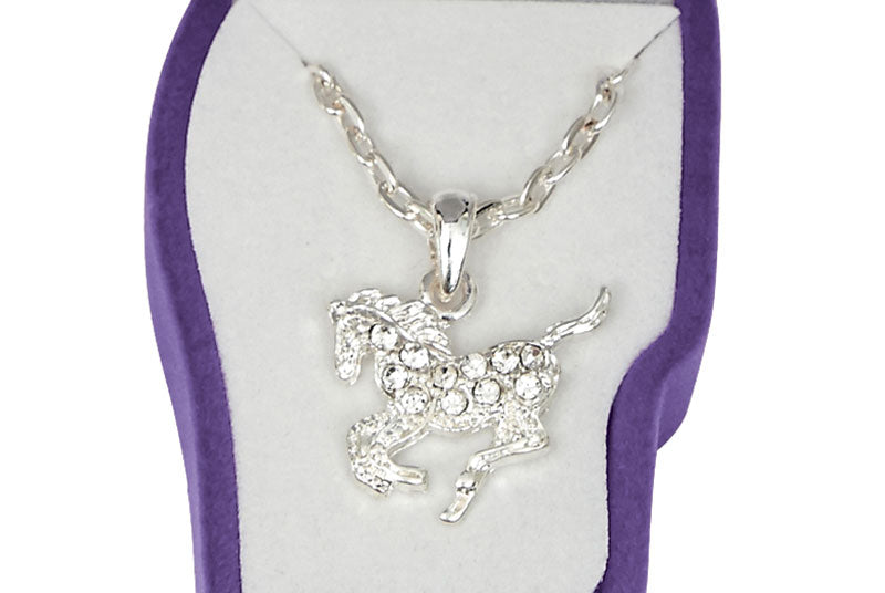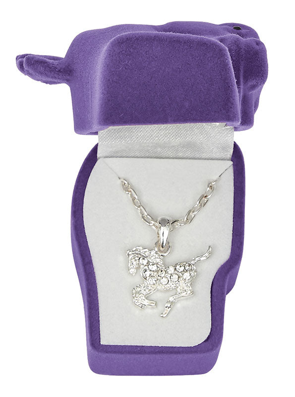 Precious, Silver-colored Galloping Pony Necklace with Clear Rhinestones in a colorful, velour Horse Head Gift Box. Box colors may vary. Pendant measures 3/4" x 5/8". Horsehead Gift Box measures 2" x 2-1/2" x 1-1/4." Both items packaged in a white box that measures 2-3/4" x 2-1/4" x 1-1/2". Necklace is silver plated and lead safe.