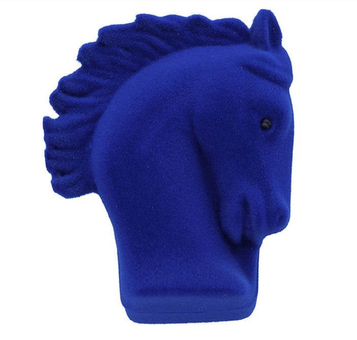 Pony necklace with blue rhinestones is packaged in a velour pony head gift box.