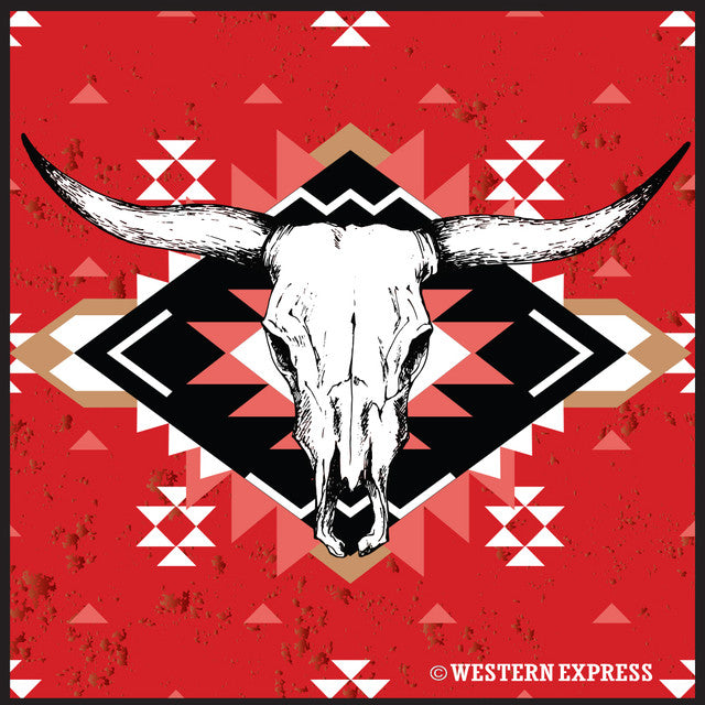 Our exclusive Western Express bandana features a Southwestern pattern background with a steer skull center design. Branded and individually packaged.