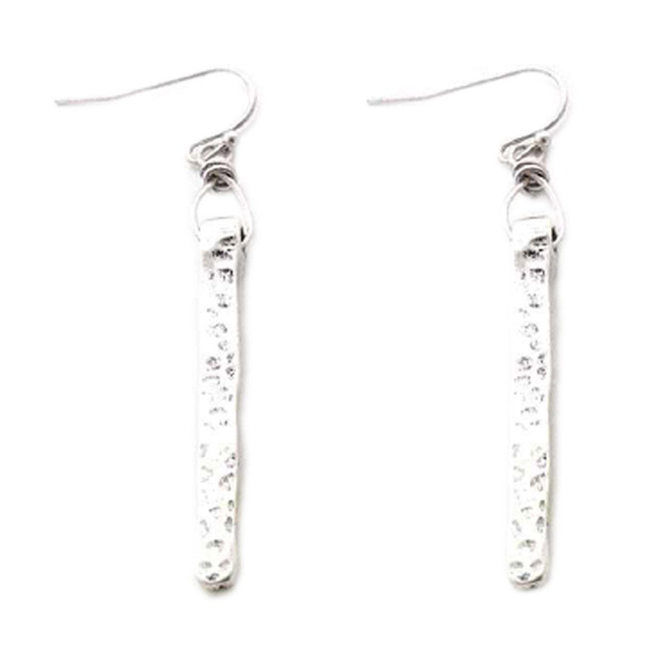 Silver finish textured dangling bar earrings.