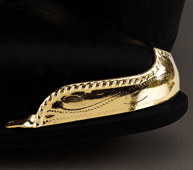 Gold tone boot tip with etched filigree and rope border design. Sold in pairs, these fit most standard pointed toe boots. Nails are included for easy attachment.