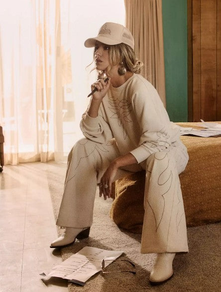 Effortless, easy, endlessly cool—the Lainey Wilson x Wrangler® Cowboy Sweatshirt will become an instant favorite in your lineup. This cozy crewneck is made of a cotton blend with a peached finish to surround you in softness. It features a relaxed fit with dropped shoulders for a laidback look and feel. Plus, this pullover’s finished with a graphic print that mimics stitching across the front and on each sleeve. As a nod to just how hands-on Lainey was in the creation of this collection, you’ll find her initials stitched at the cuff.