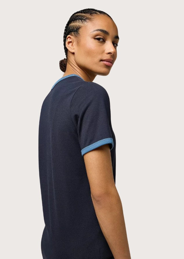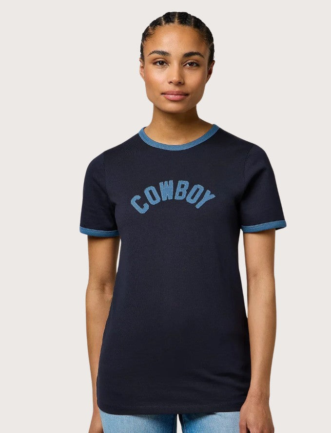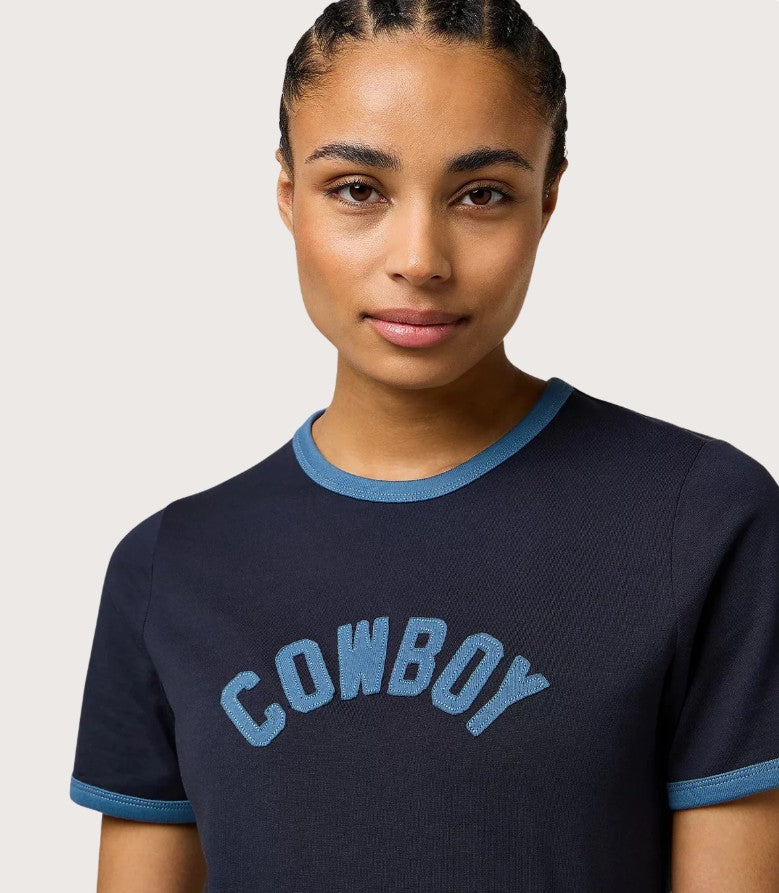 Embrace a true throwback with an authentically Western edge in the Wrangler Womens Ringer T-Shirt in Navy.