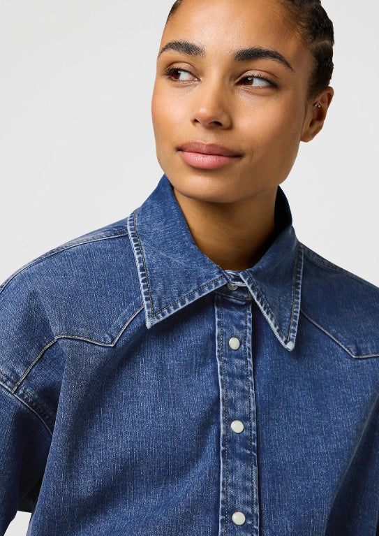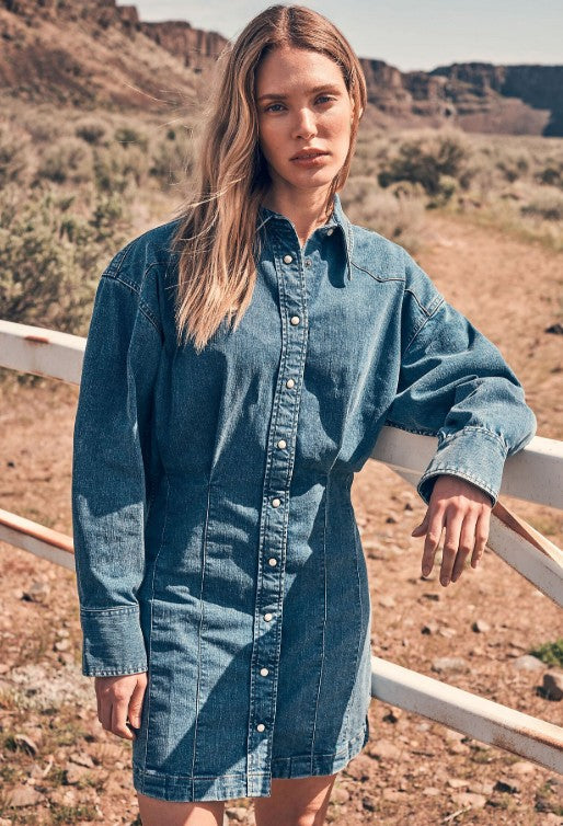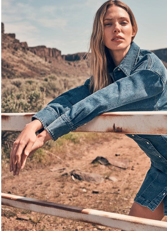 Flattering slim fit with a cinched-in waist to create even more shape. Designed with a full snap button front, adjustable snap cuffs and a pointed collar. The authentic denim blue wash is easy-to-wear, versatile and timeless.