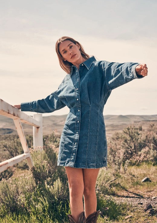 The Darted Skirt Dress combines soft stretch cotton with all the best Western details, making it an easy-to-wear denim go-to. Drawing on the Western styling you love and trust, the Darted Skirt Dress is made from comfort stretch cotton that's soft to touch and won't leave you feeling restricted. The skirt part of the dress is made out of darts, which are essentially pleats that sit on top of each other. This technique helps create volume and provides an all-around flattering shape – perfect for wearing with your favourite cowboy boots.
