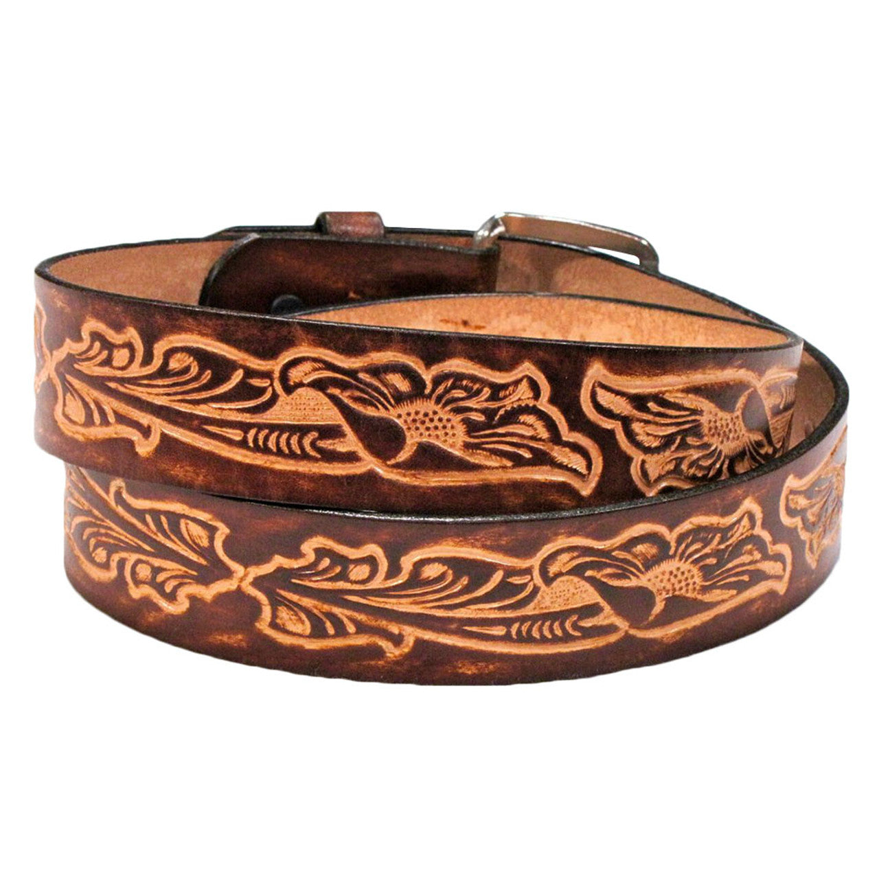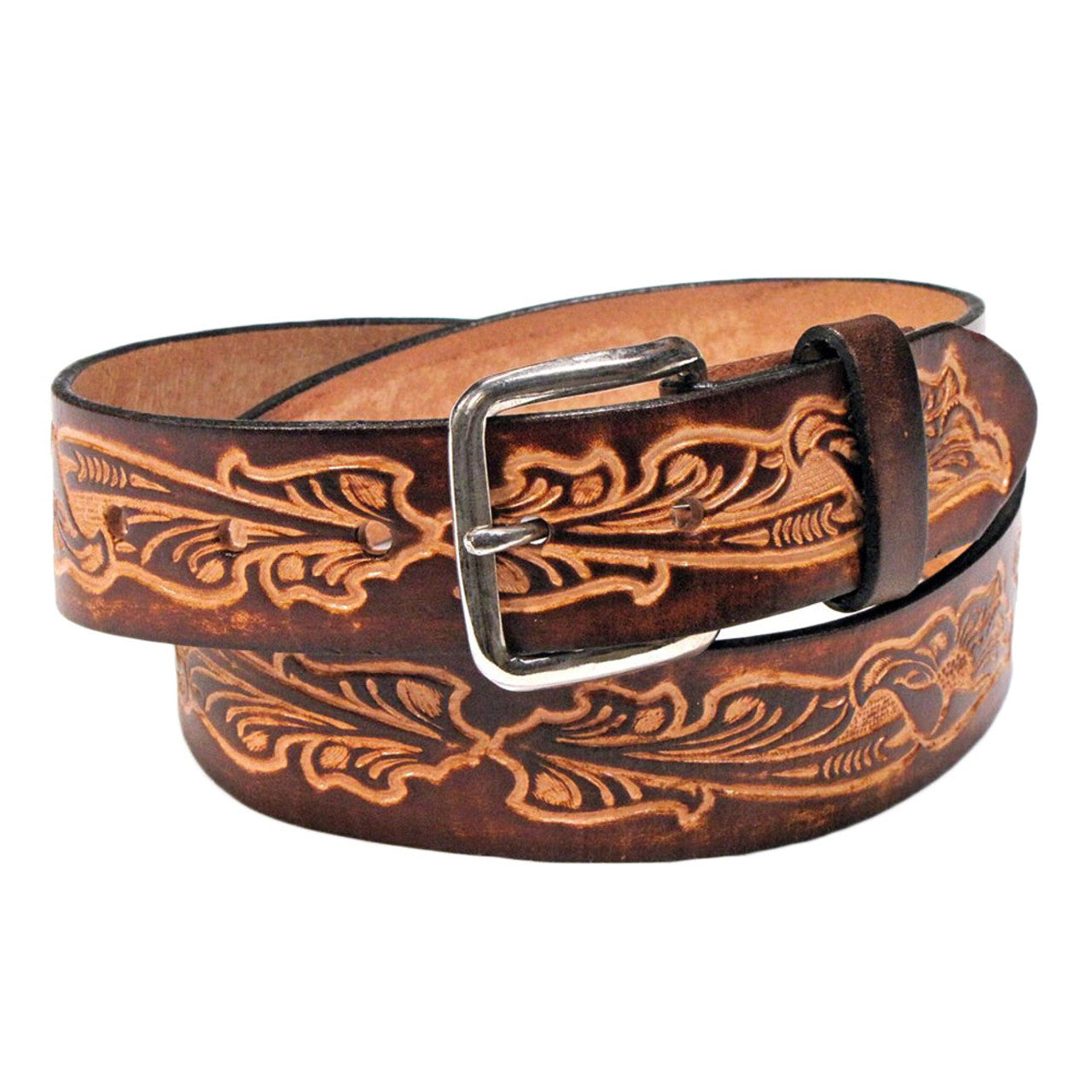 This genuine leather belt has a brown antique finish with a western scroll design. The belt is 1.5 in wide and has a removable buckle. Made in the USA.